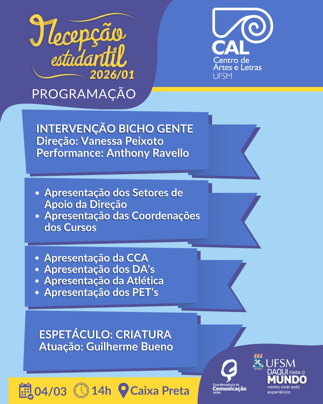 Confira AQUI o guia com informações sobre serviços institucionais como UFSM Digital, Restaurante Universitário, e-mail institucional, linhas de ônibus, Benefício Socioeconômico, saúde e apoio psicossocial. Mais sobre Recepção Estudantil: AQUI