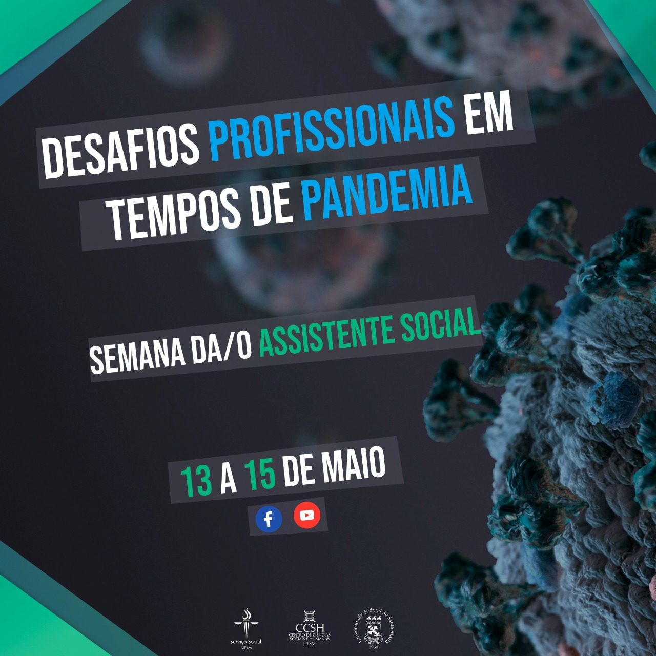 A Semana do Assistente Social do Curso de Serviço Social da UFSM está sendo realizada até esta sexta-feira (15) de forma virtual, devido à pandemia da Covid-19. As atividades diárias podem ser acompanhadas por todos os interessados por meio do Youtube e do Facebook. Vídeos sobre temas atuais e relevantes para a profissão, a maioria deles relacionados à pandemia, são publicados às 19h.