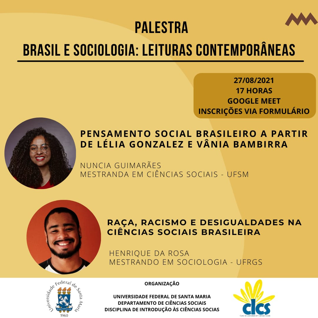 O evento “Brasil e Sociologia: leituras contemporâneas”, organizado como Prática como Componente Curricular da disciplina de Introdução às Ciências Sociais, do curso de Ciências Sociais/CCSH, será realizado nesta sexta-feira (27), às 17h, pelo Google Meet.