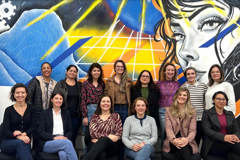 Foto colorida horizontal de grupo de 14 mulheres. Elas estão posicionadas em frente a um painel colorido e estilizado com uma mulher e um sol. Do grupo, seis estão sentadas e oito estão em pé, atrás das que estão sentadas.