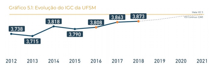 O relatório descreve os sete desafios institucionais, demonstrando seus resultados em relação ao  plano de metas e objetivos estratégicos planejados no PDI. O gráfico abaixo foi extraído do relatório, e representa a evolução  do Índice Geral de Cursos (IGC) da UFSM, indicador que mensura uma das principais metas da instituição, “ser uma universidade de excelência.” O relatório traz o índice do ano de 2018, e demonstra a tendência de crescimento dos anos anteriores. É possível observar que em 7 anos (2010 a 2016) a UFSM elevou 0,10 pontos no IGC. Para atingir a principal meta da UFSM, o conceito 5, será necessário o aumento do índice em 0,14 pontos no período de 5 anos. Esse crescimento é um grande desafio para a UFSM, mas também representa um salto de qualidade necessário para entre o seleto grupo das instituições de excelência do país (aquelas com conceito IGC na faixa 5).