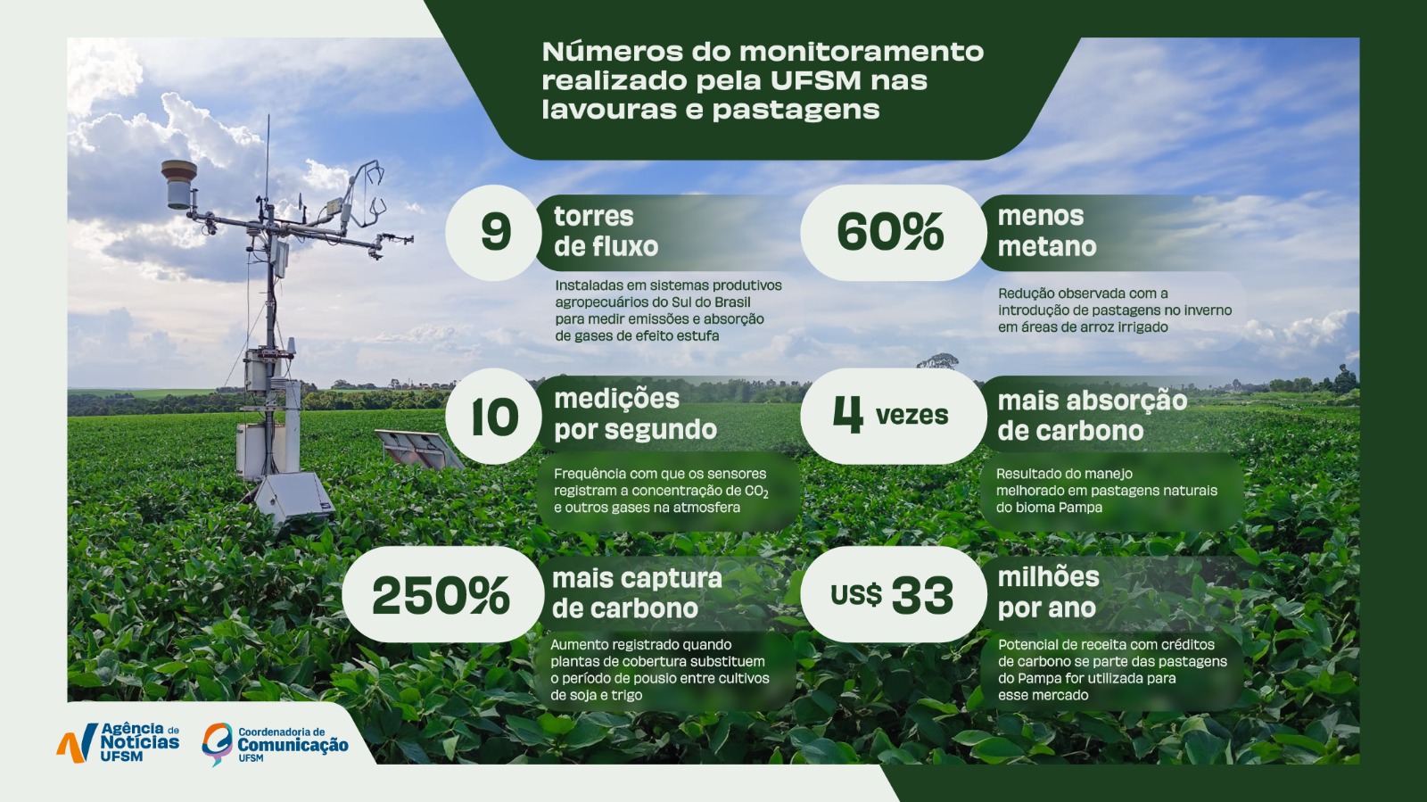 Os resultados das pesquisas conduzidas pela UFSM têm indicado que práticas agrícolas adequadas podem transformar lavouras e pastagens em aliadas importantes no combate às mudanças climáticas, ao ampliar a captura de carbono e reduzir emissões de gases de efeito estufa.