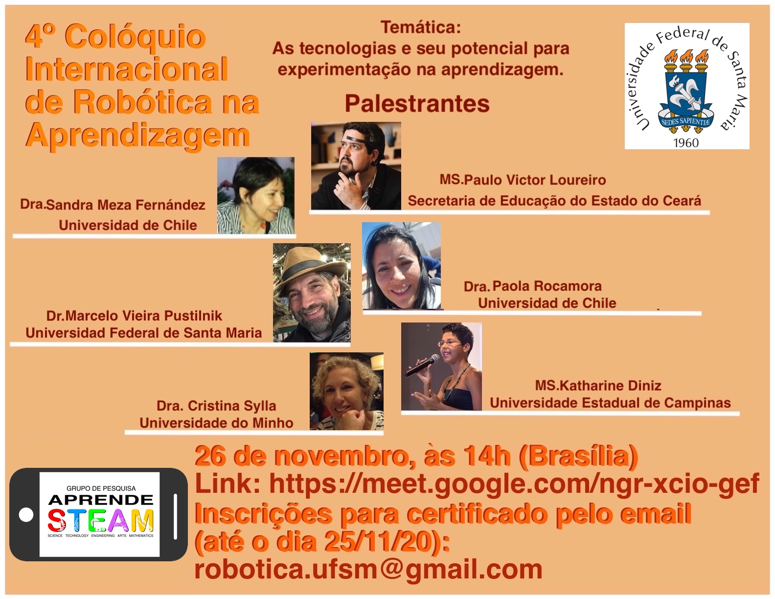 O Grupo de Pesquisa Aprende Steam, do Centro de Educação (CE) da UFSM, realizará no dia 26 de novembro, das 14h às 17h, o 4º Colóquio Robótica na Aprendizagem, que neste ano amplia sua temática para um olhar além da  robótica educacional e avança para a cultura maker e a experimentação na aprendizagem. Tendo como tema central "As tecnologias e seu potencial para experimentação na aprendizagem", o evento contará com a participação de pesquisadores do Brasil, Chile e Portugal.