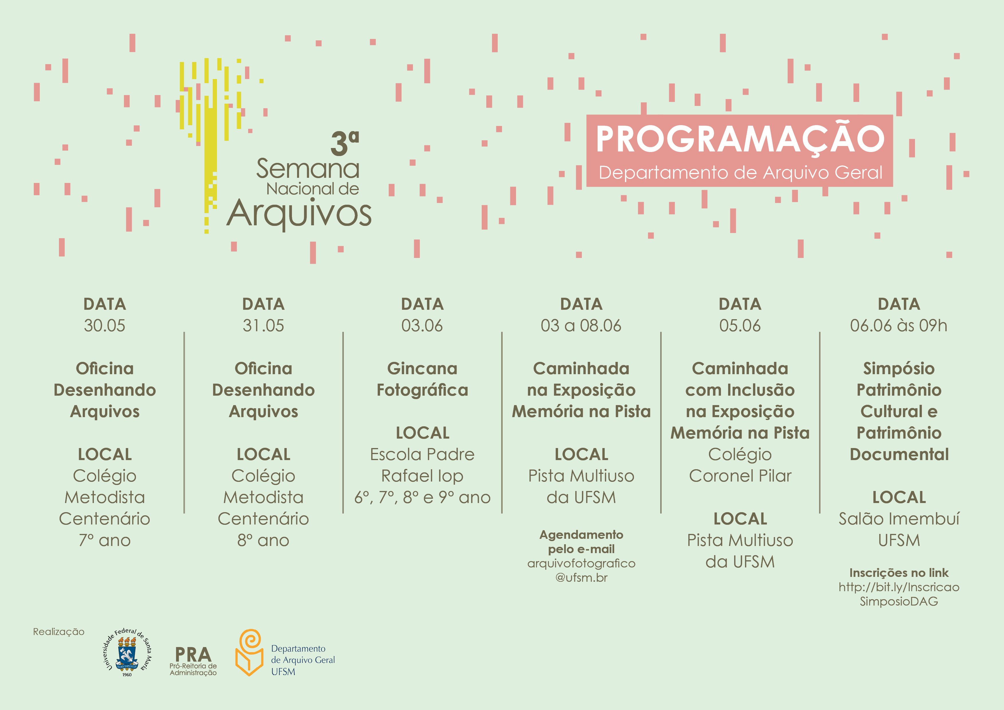 O Departamento de Arquivo Geral da UFSM (DAG) promove uma série de atividades alusivas à 3ª Semana Nacional de Arquivos, que acontece de 3 a 8 de junho em todo o Brasil. O DAG organizou um projeto de extensão com uma série de atividades, como exposições, oficinas e palestras.