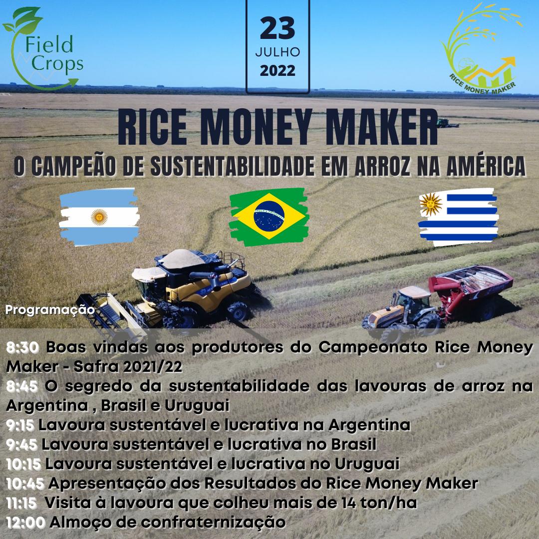 No dia 23 de julho, será realizada a entrega de resultados e a premiação do grande campeão em produção sustentável em arroz da América Latina do Rice Money Maker – Safra 2021/2022, que conta com produtores da Argentina, Uruguai e Brasil, e promove interação entre produtores e técnicos, compartilhando conhecimento e experiências dos países participantes.