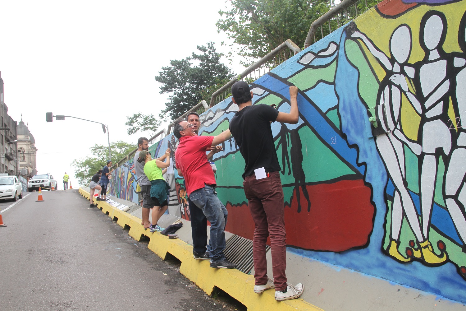 [caption id="attachment_45789" align="alignleft" width="400"]Pessoas pintam painel no muro que leva em direção ao viaduto Evandro Behr Professores e alunos de Artes Visuais envolveram-se na pintura do painel[/caption]