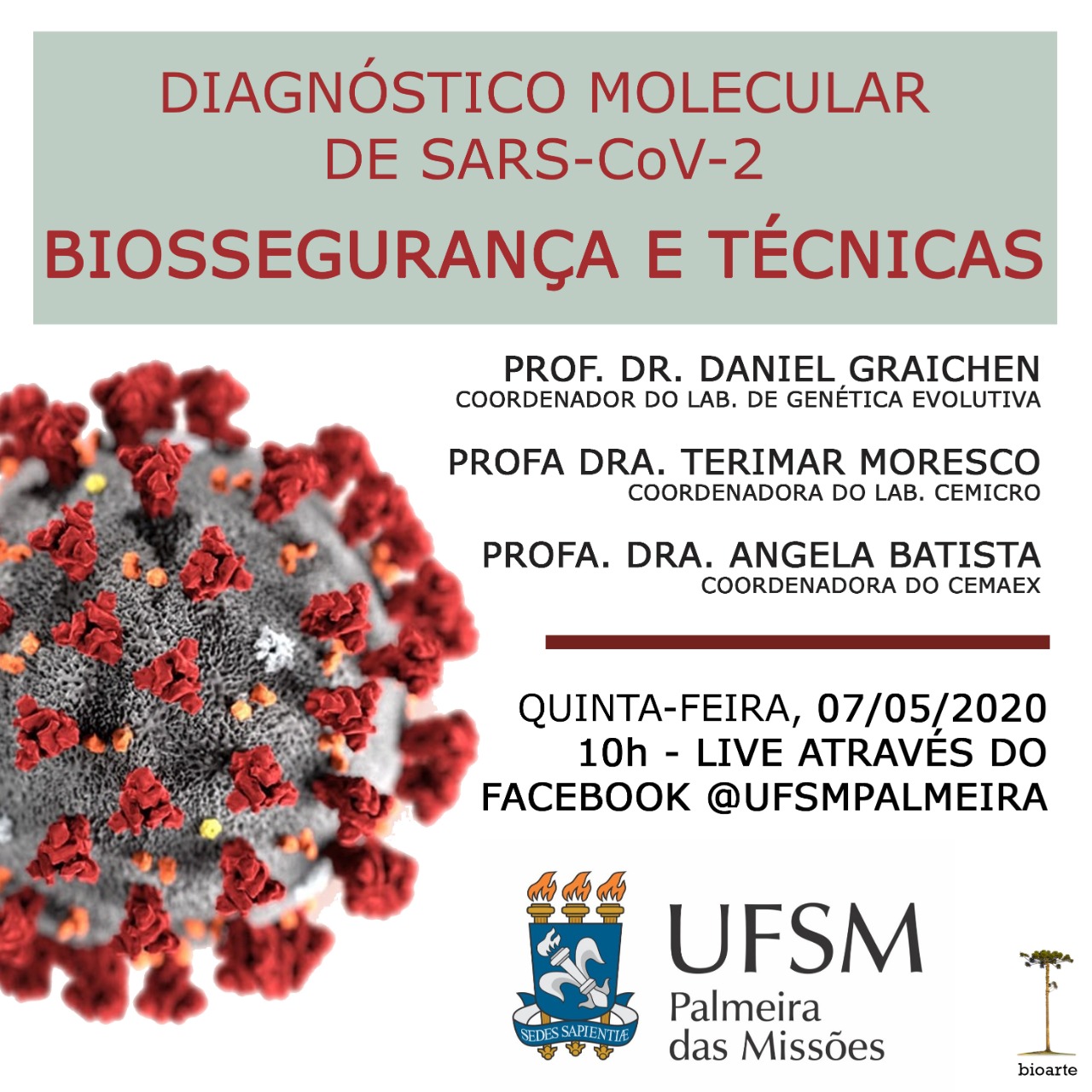 Nesta quinta-feira (7), às 10h, será realizado no campus da UFSM de Palmeira das Missões o Seminário Técnico “Diagnóstico Molecular de SARS-CoV-2: Biossegurança e Técnicas”. A atividade, promovida pelos Laboratório de Genética Evolutiva e Microbiologia, será destinada aos agentes de saúde envolvidos nos diagnósticos da Covid-19 no município e cidades da região. Além da equipe da UFSM, estarão presentes médicos, enfermeiros, agentes de saúde diretamente envolvidos na linha de frente do diagnóstico, e integrantes do COE – Centro de Operações Emergenciais de Palmeira das Missões.