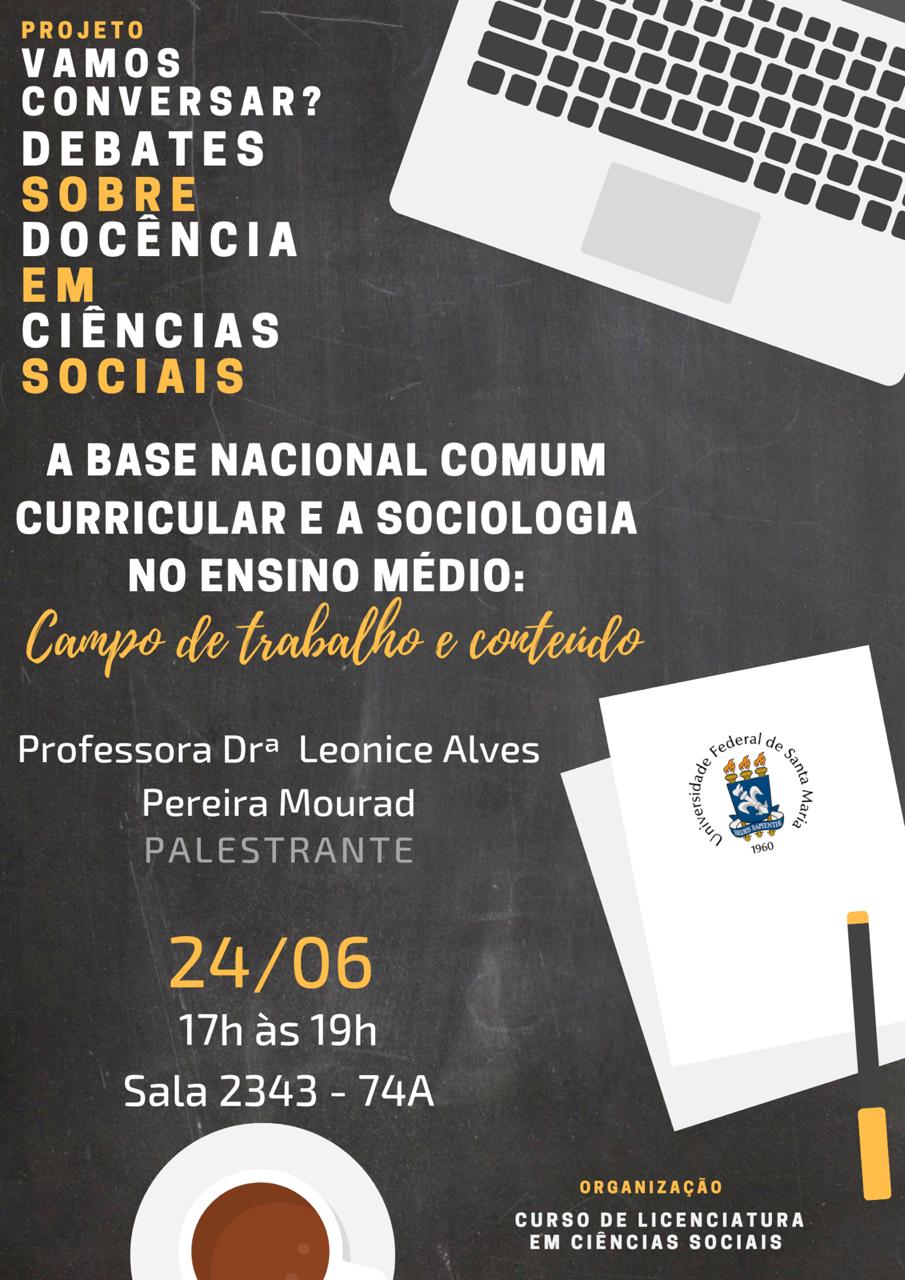 A atividade vai analisar os impactos da Base Nacional Comum Curricular (BNCC) na disciplina de Sociologia no Ensino Médio. A palestra, com a professora Leonice Alves Pereira Mourad, do Departamento de Metodologia de Ensino, do Centro de Educação, tratará das questões que envolvem a BNCC relacionadas à Sociologia no Ensino Médio, incluindo campo de trabalho e organização de conteúdos nas novas definições, entre elas a reforma do Ensino Médio, a qual altera a organização disciplinar e os processos formativos.