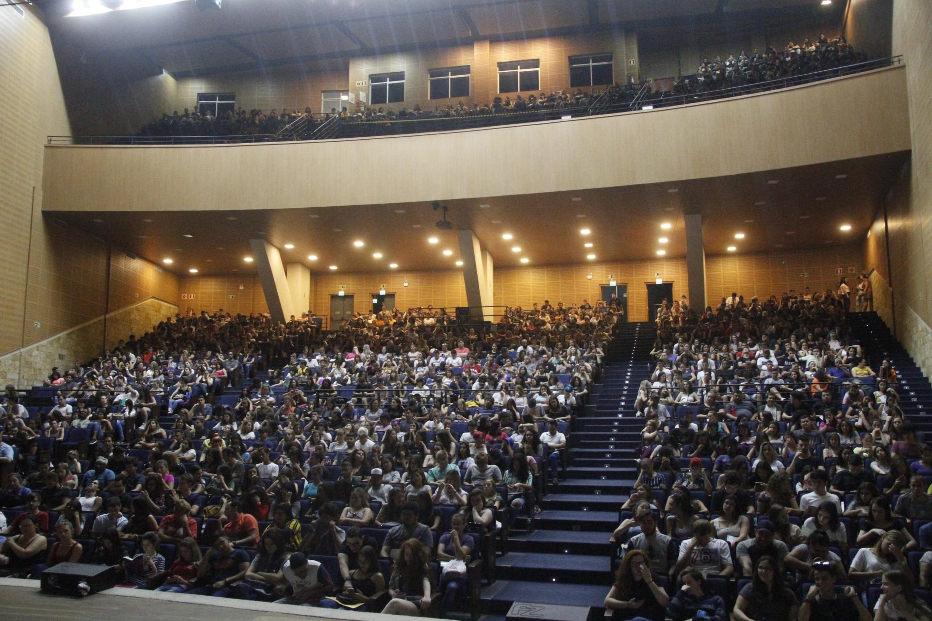 [caption id="attachment_51140" align="alignright" width="530"] Calouros são recepcionados por veteranos no Centro de Convenções[/caption]