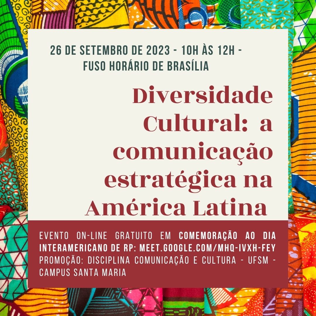 Na próxima terça-feira (26), às 10h, será realizado o evento online "Diversidade cultural: a comunicação estratégica na América Latina". A atividade reunirá profissionais de comunicação estratégica do Uruguai, Chile, Peru e Argentina para dialogar sobre suas realidades e desafios de atuação.