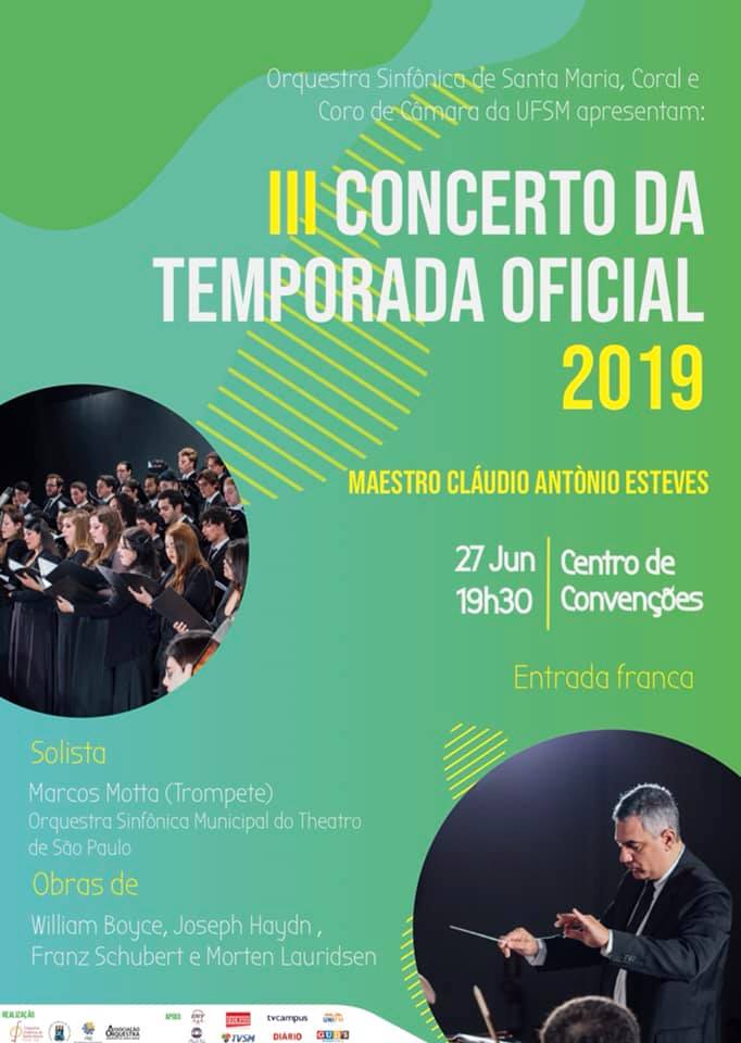 Arte com informações sobre o evento. Fundo em tons de verde com duas fotos da orquestraNo dia 27 de junho o maestro Cláudio Esteves e o Coral e Coro de Câmara da UFSM sobem novamente ao palco do Centro de Convenções com a Orquestra para um grande espetáculo. Além destes convidados, a Orquestra recebe para a regência da missa dois estudantes cujos trabalhos têm enriquecido a cidade e vêm despontado no estudo e na arte da regência: Elen Janine Ortiz e Lucas Siduoski.
