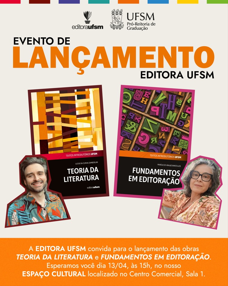 A Editora da Universidade Federal de Santa Maria (UFSM) promove, no dia 13 de abril, às 15 horas, o lançamento das obras Teoria da Literatura e Fundamentos em Editoração. A atividade propõe um momento de celebração da escrita, da leitura e da produção acadêmica, reunindo diferentes perspectivas sobre o campo literário e editorial.