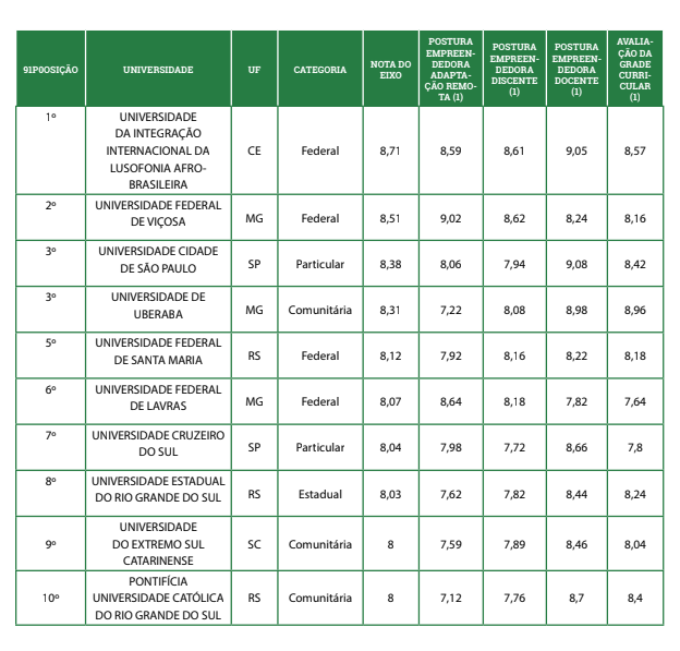 Ranking das 10 universidades com maior cultura empreendedora no país (Fonte: Brasil Júniori)