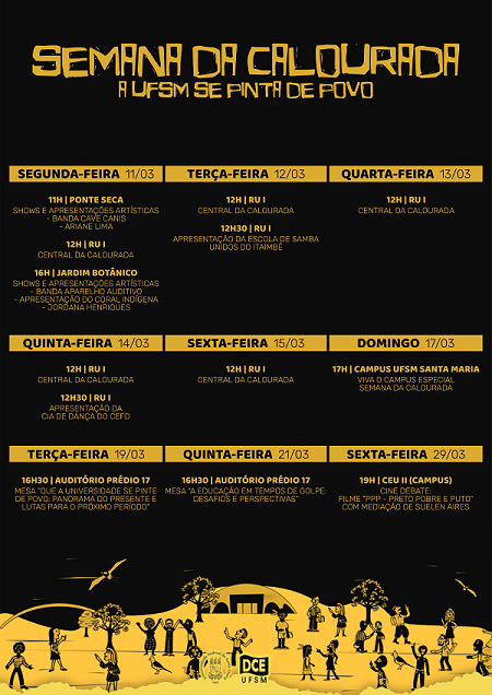 Uma intensa programação de atividades marca o início das atividades letivas na UFSM. Durante a Semana da Calourada, as unidades universitárias, centros de ensino e campi da instituição desenvolvem uma série de ações visando a recepção e a integração de calouros e veteranos.