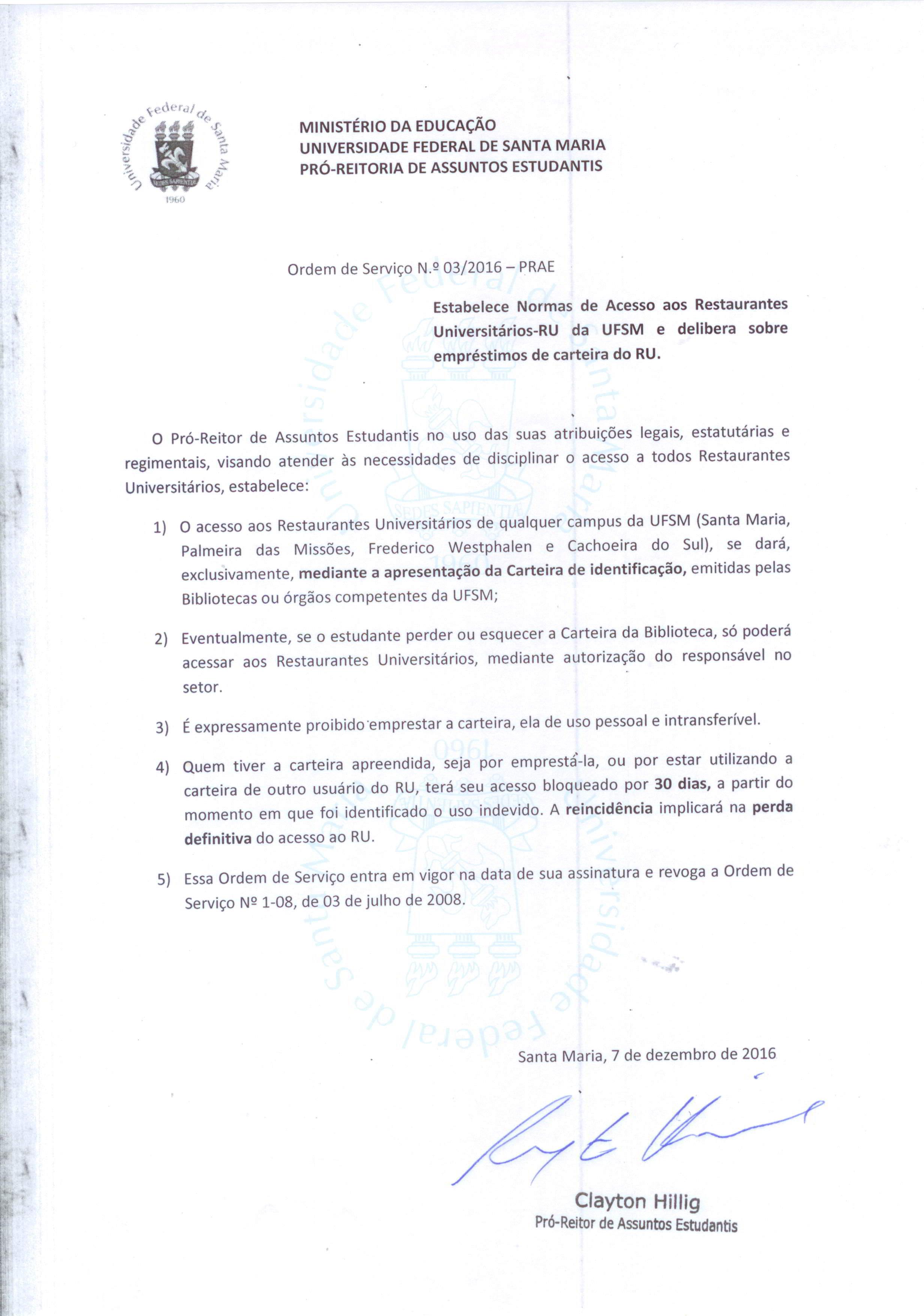 Para usufruir dos serviços do Restaurante Universitário é necessário ter em mãos a carteira RU, que serve para a compra de créditos. Esta é de uso pessoal e intransferível, quem for pego a emprestando ou utilizando a carteira de outro usuário, terá o seu acesso bloqueado por um mês, a partir do momento em que a infração for identificada. Caso haja reincidência, o usuário terá perda definitiva do acesso ao RU (Ordem de Serviço n. 03/2016 – PRAE).