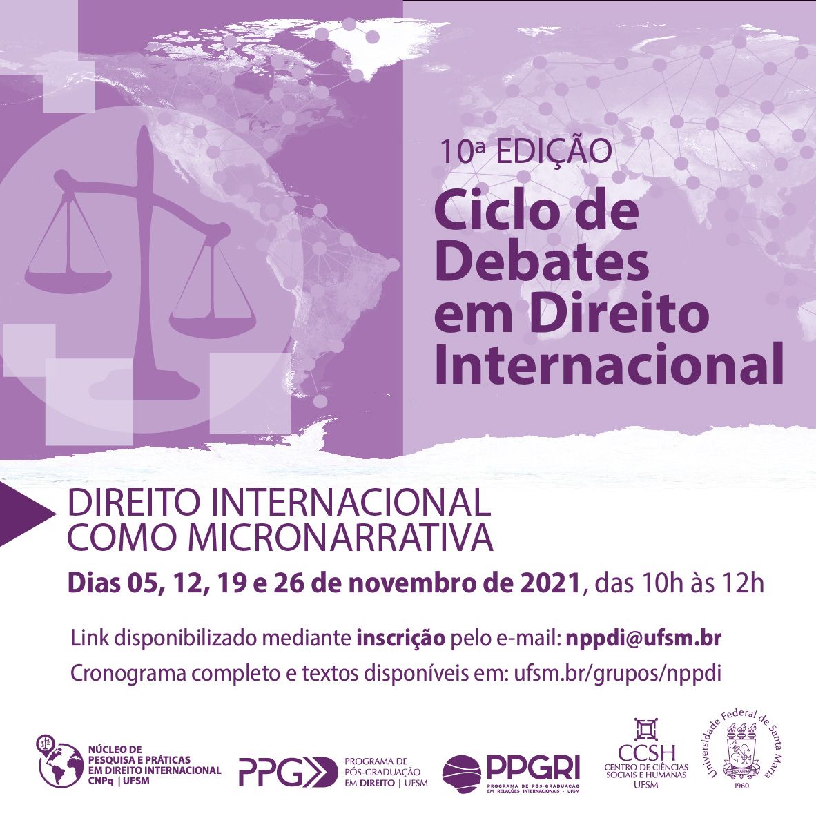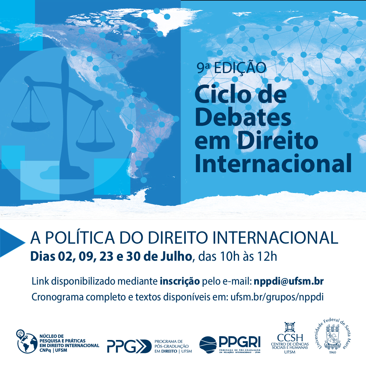 O  Núcleo de Pesquisa e Práticas em Direito Internacional (NPPDI - CNPq/UFSM) convida para a 9ª Edição do Ciclo de Debates em Direito Internacional: A POLÍTICA DO DIREITO INTERNACIONAL.