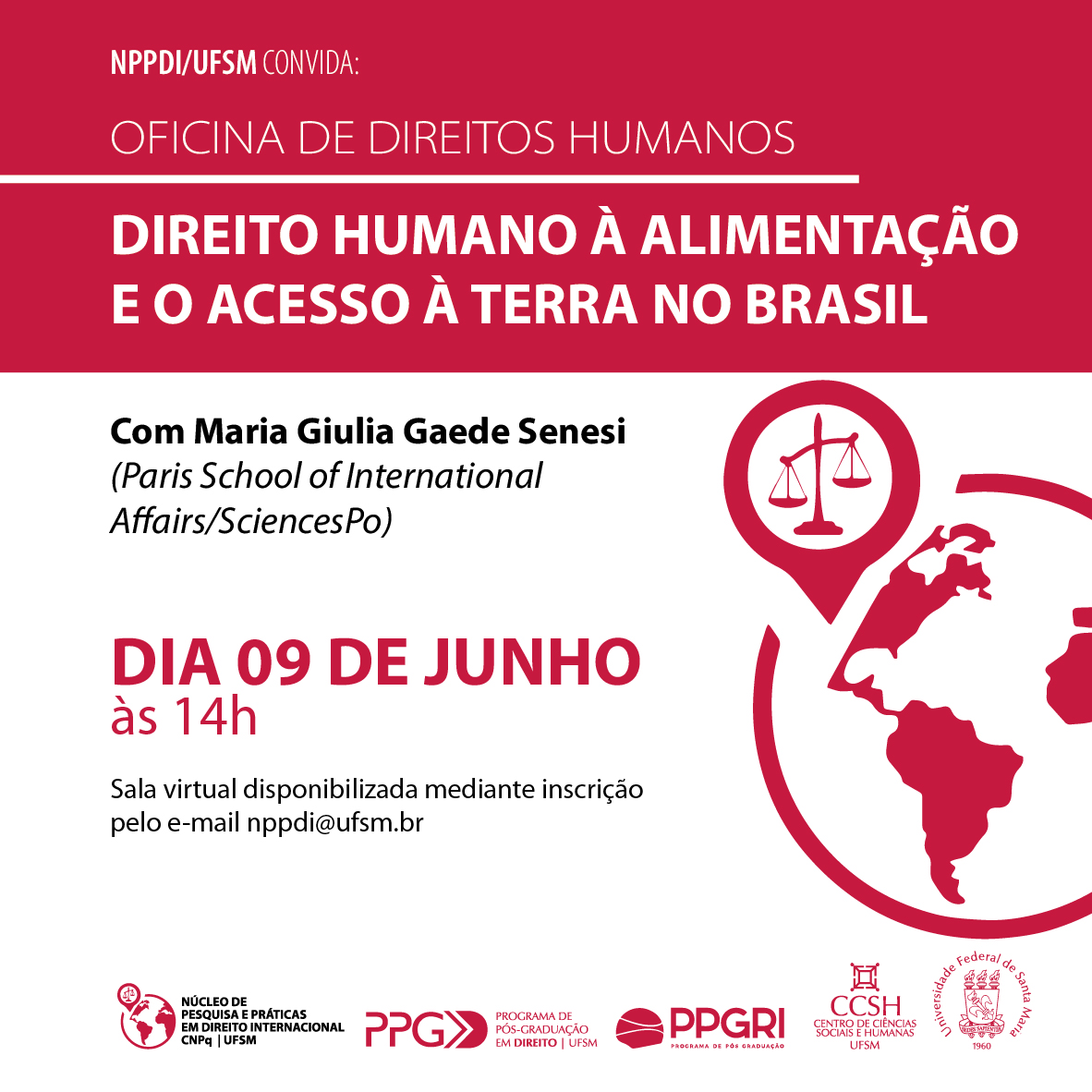 O Núcleo de de Pesquisas e Práticas em Direito Internacional (NPPDI) convida para a Oficina de Direitos Humanos intitulada "Direito Humano à alimentação e o acesso à terra no Brasil", com Maria Giulia Gaede Senesi  (Paris School of International Affairs / SciencesPo). A atividade será realizada no dia 9 de junho (quarta-feira), às 14h na sala virtual disponibilizada mediante inscrição pelo e-mail nppdi@55bet-pro.com