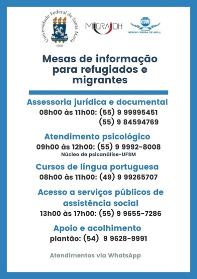 Com as ações desenvolvidas pelo Migraidh e Cátedra Sérgio Vieira de Mello, a universidade atua no local, para além dos muros, prestando atendimento e contribuindo para a integração de migrantes e refugiados, no escopo de suas ações. Além disso, colabora com o processo de formulação e construção de políticas públicas voltadas a migrantes e refugiados e fortalecimento da cooperação com os poderes públicos e sociedade civil. Exemplo desta atuação, foi a Moção de Apoio concedida em 2017 pela Câmara de Vereadores à Carta de Santa Maria sobre Políticas Públicas para Migrantes e Refugiados. Neste ano, o Migraidh promoverá uma conferência preparatória à Conferência Municipal de Saúde Mental do Município de Santa Maria.