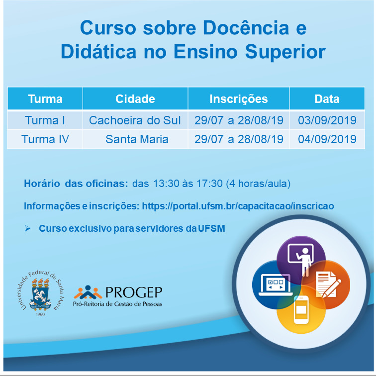 Arte colorida em formato quadrado com informações sobre o cursoA Pró-Reitoria de Gestão de Pessoas informa que estão abertas as inscrições para o curso sobre docência e didática no ensino superior, que será realizado no dia 3 de setembro, no campus de Cachoeira do Sul, e no dia 4 de setembro, no campus de Santa Maria.