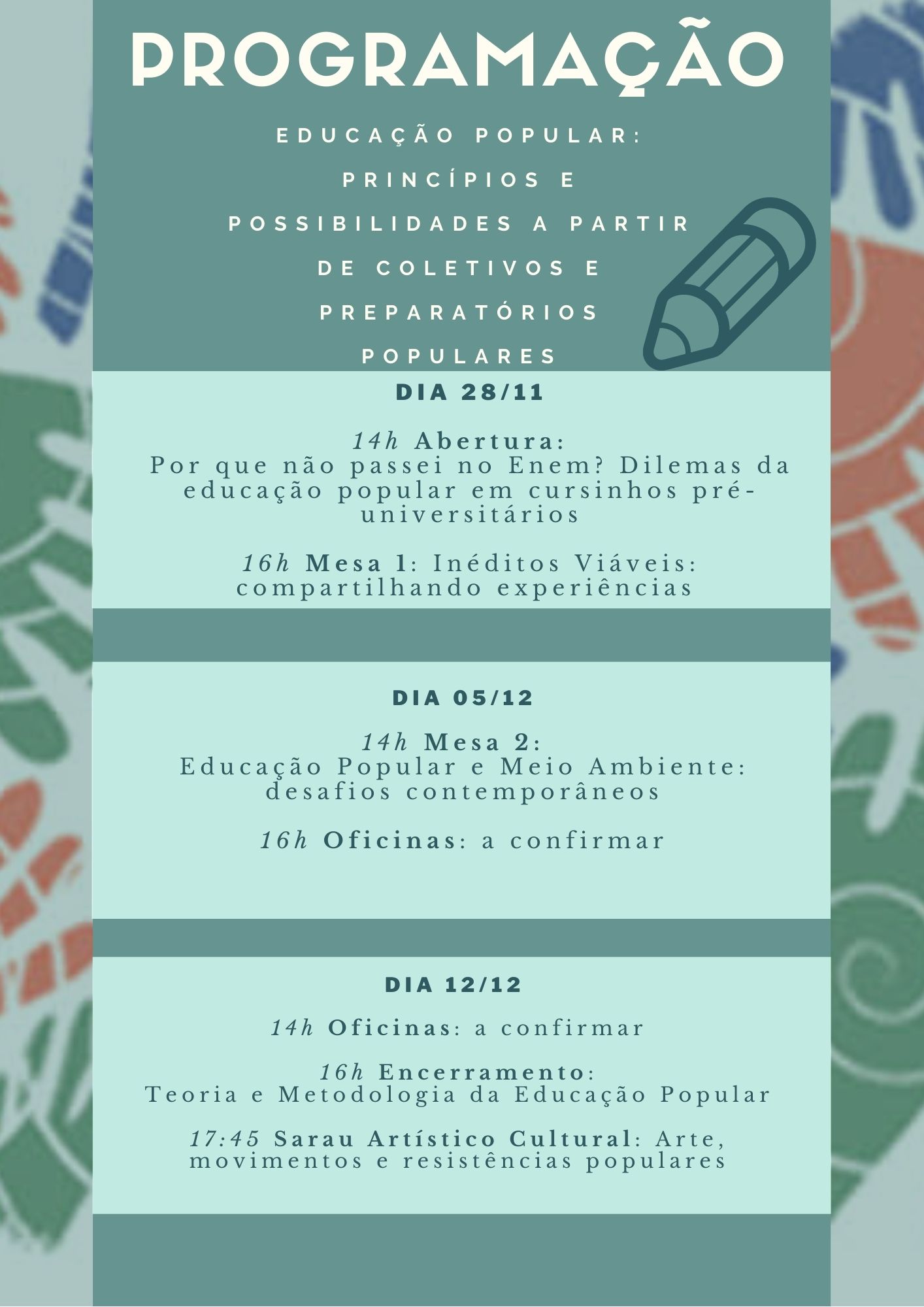 O evento ocorrerá nos dias 28 de novembro, 5 e 12 de dezembro, via Google Meet, e tem por objetivo propiciar ao público de preparatórios e coletivos fundamentados na educação popular um espaço de interlocução e troca de conhecimentos. Ao final do evento, será emitido certificado de participação.