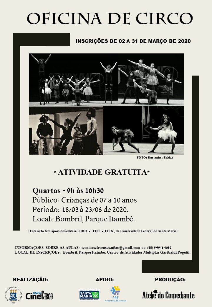 A atividade é uma realização da UFSM, através dos projetos Circo e Criança e Cinecirco, com o apoio da Prefeitura e produção do Ateliê do Comediante. O projeto tem a coordenação da professora Raquel Guerra e as atividades serão ministradas pela acadêmica Liziana da Rosa, pelo diretor Laédio José Martins e por professores convidados.