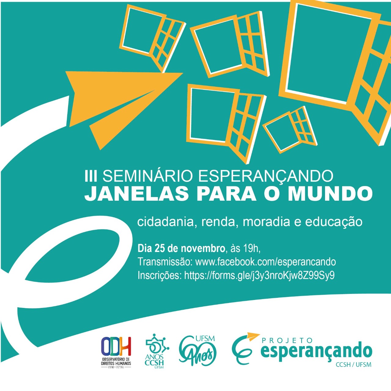 Nos dias 25 e 26 de novembro, será realizado o 3º Seminário Esperançando: Janelas para o Mundo, promovido pelo Observatório dos Direitos Humanos (ODH) e Projeto de Extensão Esperançando da UFSM. O evento, que neste ano será em formato virtual, visa proporcionar um espaço de reflexões e debates sobre a construção e fortalecimento de uma ampla rede de cooperação entre diversos setores, instituições e pessoas da sociedade santa-mariense para ajudar adolescentes acolhidos a construir sua autonomia pessoal e profissional, preparando-os para a vida pós-acolhimento.