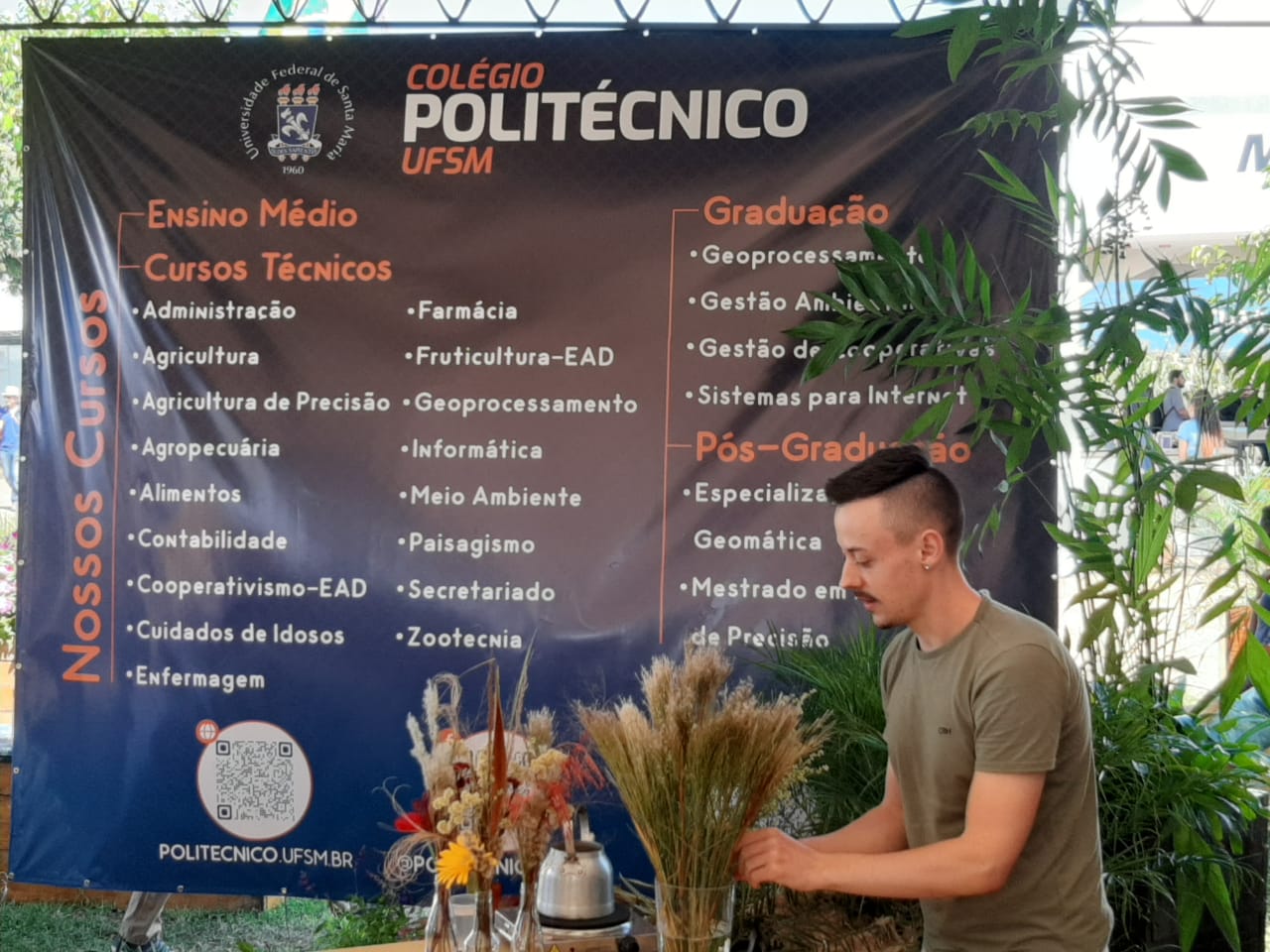 O Colégio Politécnico, em conjunto com outras unidades da UFSM e a Pró-Reitoria de Extensão, participou, entre os dias 23 e 26 de março, da Expoagro AFUBRA 2022. O evento, um dos maiores da Agricultura Familiar no Brasil, abriga empreendimentos da agricultura, pecuária e agroindústria familiar, assim como de flores, artesanato rural, implementos e insumos agropecuários. No estande da UFSM, foram ministrados pelo Colégio Politécnico minicursos de técnicas de estacas e enraizamento, arranjos florais, minijardins, relógio biológico de plantas medicinais e beneficiamento e comercialização de plantas medicinais. Estima-se que, ao longo dos 4 dias, aproximadamente 400 pessoas participaram dos minicursos. As apresentações foram realizadas por alunos do Colégio Politécnico e a organização foi realizada pelo Departamento de Pesquisa e Extensão do Colégio Politécnico, com colaboração do Setor de Floricultura (Floresce), do Departamento de Infraestrutura e do Departamento de Finanças.