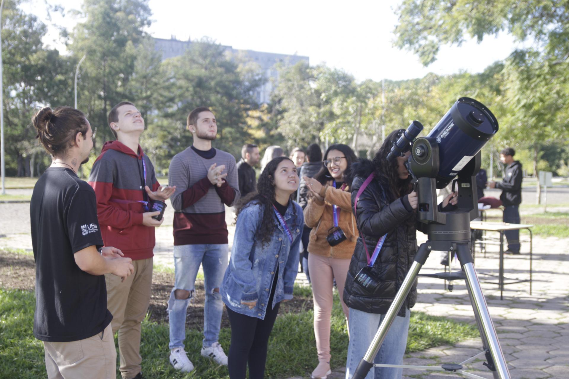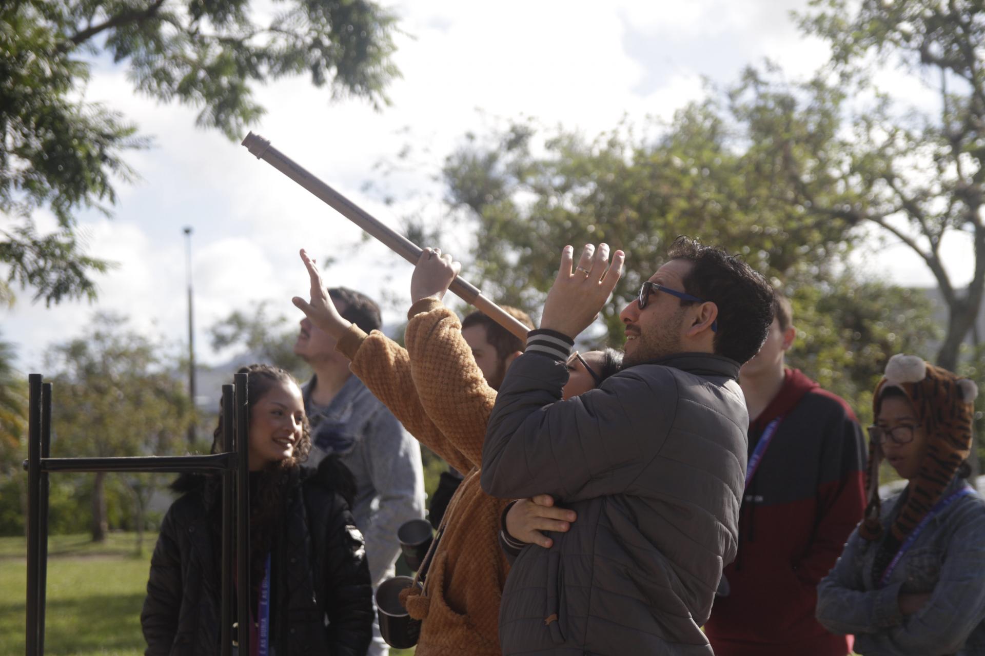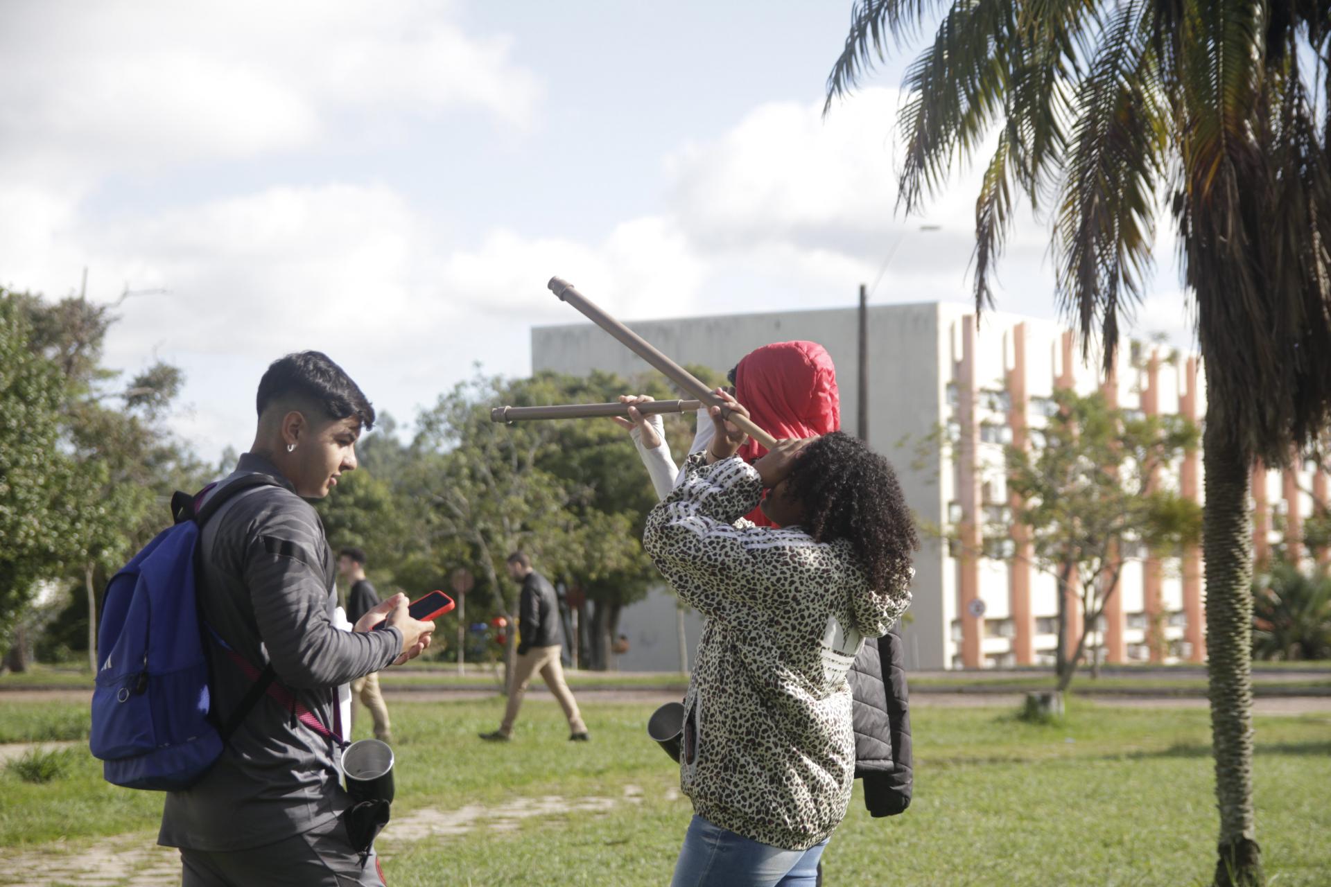 A manhã de atividades foi dividida em duas partes. Na primeira, os estudantes tiveram uma sessão no Planetário. Após, eles foram divididos em grupos e, no entorno do Planetário, construíram suas lunetas, com o auxílio dos quatros alunos da turma de Física. Nesse momento, cada um pôde experimentar como era observar o céu através de um telescópio profissional. “Para comparar as diferenças. O que a gente consegue observar com a luneta que eles construíram e o que conseguem observar com aquele outro instrumento [o telescópio]", comentou Inés.