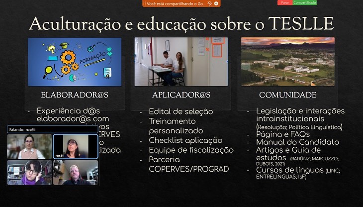 A formação com as professoras da UFSM visou a auxiliar a equipe da UFFS na implementação de seu próprio teste de proficiência a partir da experiência com o Teslle e suas práticas bastante consolidadas na UFSM.
