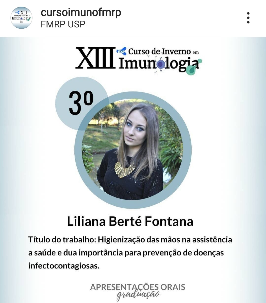 Liliana Berté Fontana, acadêmica de Ciências Biológicas da UFSM - campus Palmeira das Missões, ficou em terceiro lugar na premiação de trabalho destaque da categoria graduação no “XIII Curso de Inverno em Imunologia”, da Universidade de São Paulo - USP.