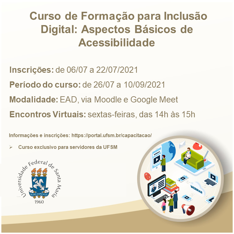 Visando incentivar a capacitação dos seus servidores neste momento de suspensão das atividades presenciais, a UFSM informa que estão abertas as inscrições para o Curso de Formação para Inclusão Digital: Aspectos Básicos de Acessibilidade, cujo objetivo é capacitar os servidores da Instituição para uma atuação inclusiva com o uso, predominantemente, de artefatos digitais, sendo uma das capacitações relacionadas à formação dos docentes dentro do escopo da UFSM em Rede.