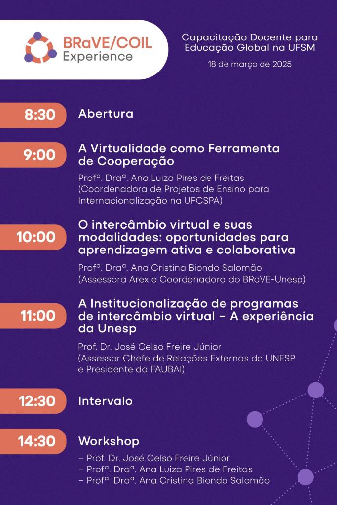 Na próxima terça-feira (18), a partir das 8h30, a Secretaria de Apoio Internacional (SAI) da UFSM realizará o evento “BRaVE/COIL Experience: Capacitação Docente para Educação Global na UFSM”. O principal objetivo é capacitar atuais e futuros docentes para o uso da metodologia BRaVE/COIL (Brazilian Virtual Exchange/Collaborative Online International Learning), um modelo de ensino que permite que professores de diferentes instituições ao redor do mundo desenvolvam atividades acadêmicas conjuntas em ambientes virtuais, promovendo uma intensa troca científica e cultural de maneira prática e sem os altos custos frequentemente associados a atividades de intercâmbio internacional.
