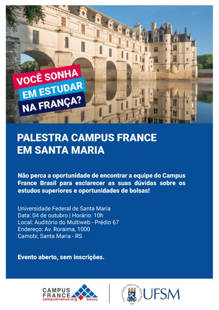 A direção do Centro de Tecnologia (CT) da UFSM informa que estão abertas as inscrições para participação em programa de intercâmbio na França. Estudantes de graduação dos cursos das Engenharias Aeroespacial, Elétrica, da Computação e de Telecomunicações podem se inscrever até o dia 7 de abril para concorrer a vagas de intercâmbio em cinco instituições de ensino superior francesas da área de Engenharia.