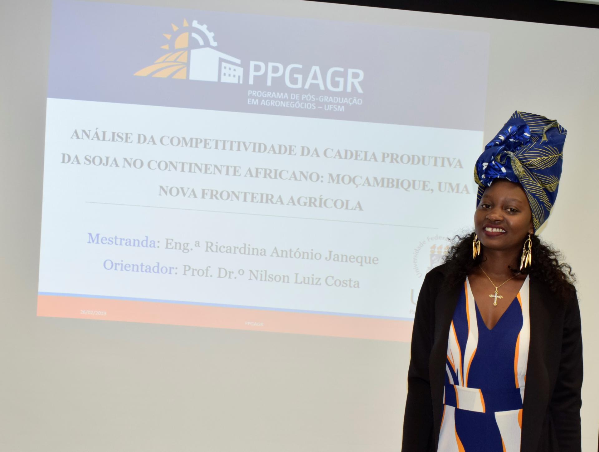 O campus da UFSM de Palmeira das Missões promoveu nesta terça-feira (26) a sua primeira defesa de mestrado de uma estudante estrangeira. Ricardina Janeque, da Universidade Zambeze de Moçambique, ingressou no Programa de Pós-Graduação em Agronegócios em 2017 e defendeu a dissertação “Análise da Competitividade da Cadeia Produtiva da Soja no Continente Africano: Moçambique, uma nova fronteira agrícola”.