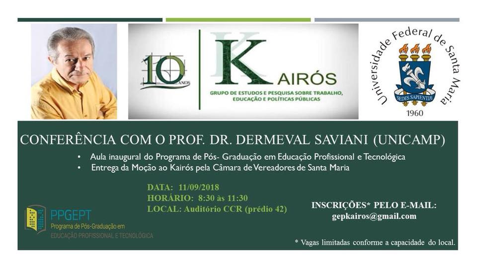 O Kairós - Grupo de Estudos e Pesquisas sobre Trabalho, Educação e Políticas Públicas e o Grupo de Estudos e Pesquisas História, Sociedade e Educação no Brasil (HISTEDBR) da UFSM promovem o curso de extensão "História das Ideias Pedagógicas no Brasil: Estudo das Pedagogias Contra-hegemônicas", que ocorrerá todas as quintas-feiras, de 8 de agosto a 28 de novembro, das 9h às 12h, pelo YouTube.