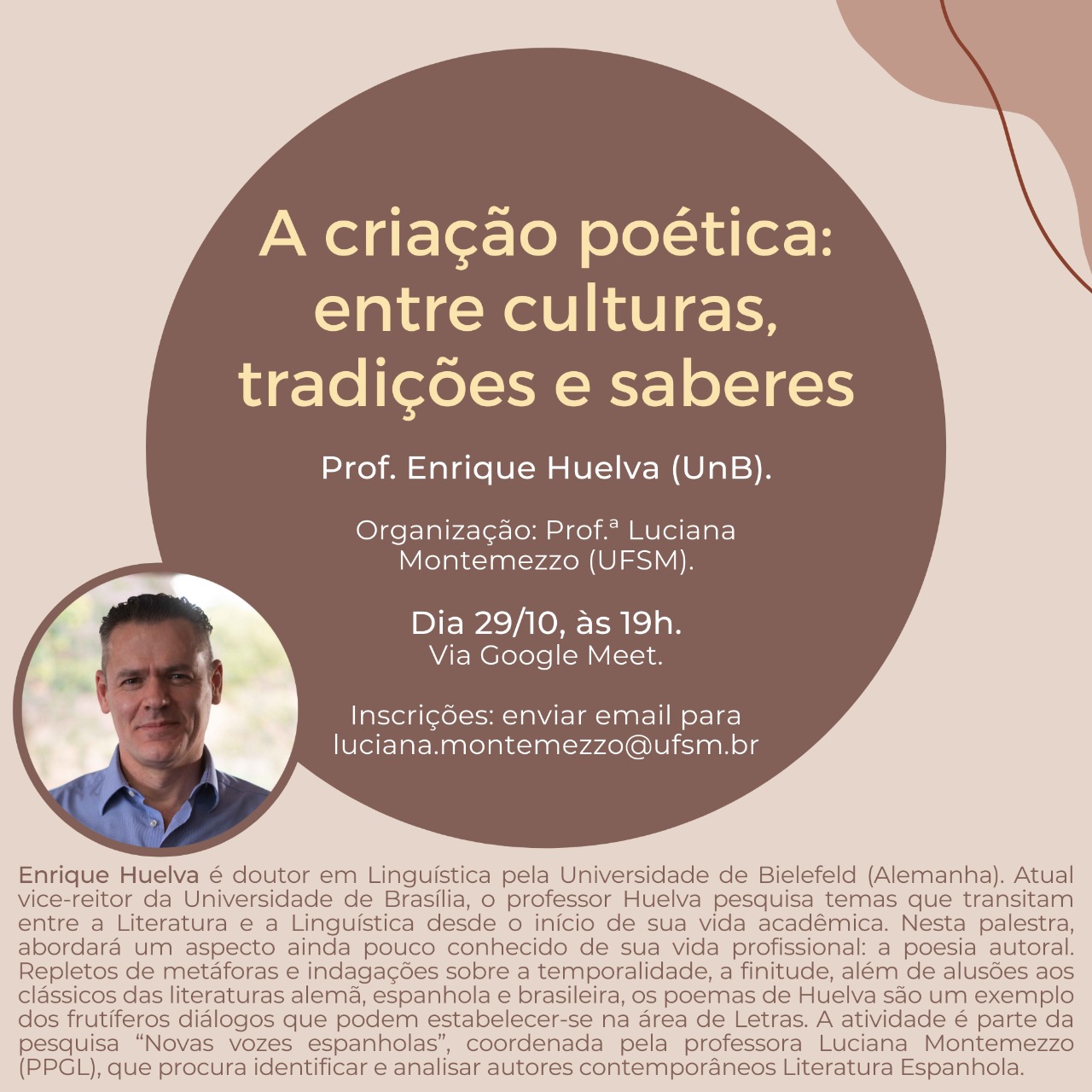 A palestra "A criação poética: entre culturas, tradições e saberes" será ministrada pelo professor Enrique Huelva, da Universidade de Brasília (UnB), nesta sexta-feira (29), às 19h.