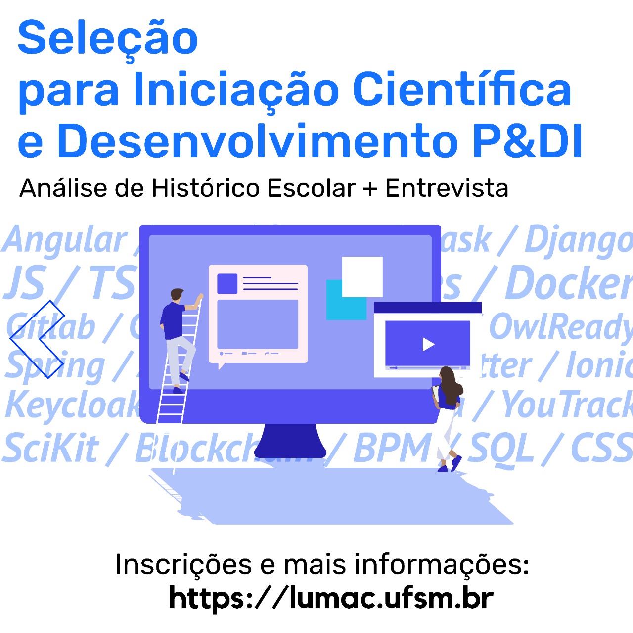 Para inscrever-se no edital, o aluno deve estar regularmente matriculado na UFSM em um curso de graduação (licenciatura, bacharelado ou tecnólogos) ou em cursos de nível médio ou subsequente dos Colégios da UFSM (Colégio Politécnico e Colégio Técnico Industrial) até o período final de vigência da bolsa, com duração de um ano. Outras informações podem ser obtidas pelo e-mail lumac@ufsm.br. Na página do laboratório, é possível conhecer mais sobre os projetos, a equipe de professores e discentes, bem como ler depoimentos sobre as atividades desenvolvidas.
