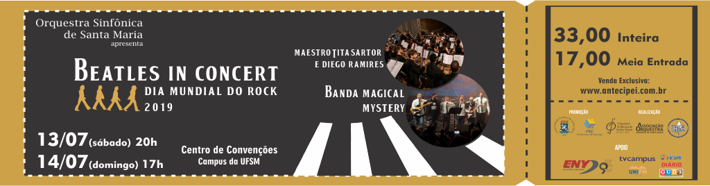 Imagem colorida horizontal reproduz ingresso do eventoA Orquestra Sinfônica de Santa Maria realiza o "Beatles In Concert" no Dia Mundial do Rock, 13 de julho, sábado, às 20h, e uma sessão extra no dia 14, domingo, às 17h. O evento reúne música erudita e popular em uma viagem pelo repertório do quarteto de Liverpool, juntamente com a banda Magical Mystery, que realiza tributos aos Beatles desde de 2014 e já apresentou este formato de evento com a Orquestra.