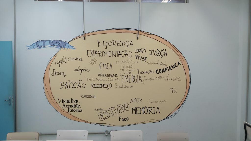A sala de estudos 1110 do Centro de Tecnologia (CT) da UFSM ganhou um mural repleto de cores, formas orgânicas e figuras diversas, transformando o espaço em um ambiente mais acolhedor e humano. Desenvolvido por Amanda Rodrigues, bolsista do CT e aluna de Arquitetura e Urbanismo, em parceria com a coordenação pedagógica mediada pela professora Evelyn Paniz, o projeto teve inspiração mediada por Simoni Timm Hermes, com base na história de Gabriel, estudante do CT com mobilidade reduzida.