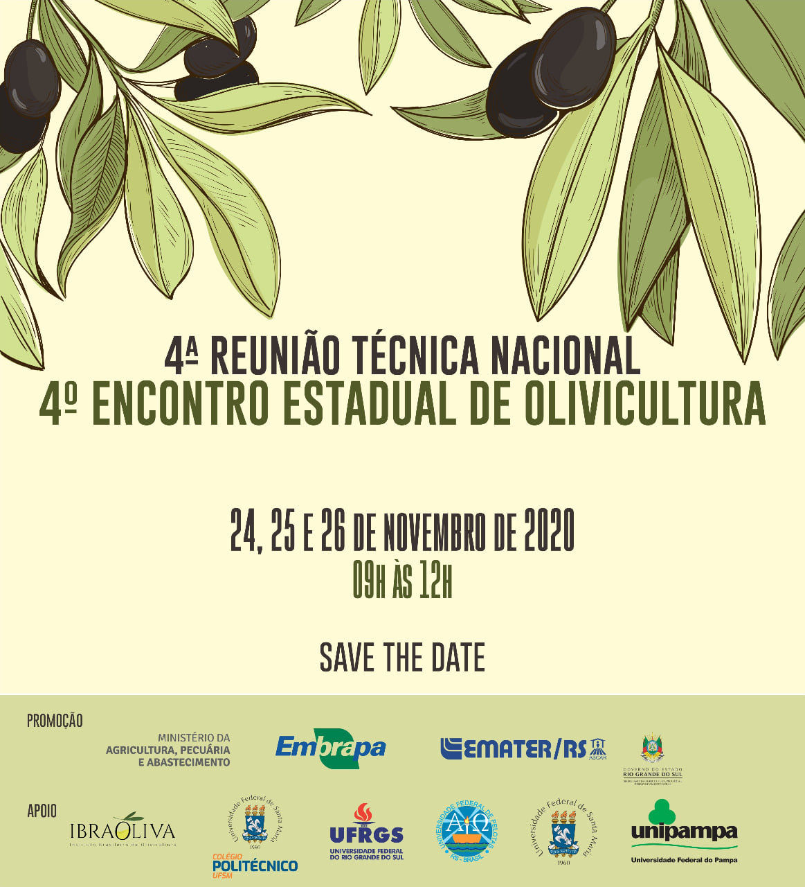 De terça (24) a quinta-feira (26) da próxima semana, acontece a 4ª Reunião Técnica Nacional e o 4º Encontro Estadual de Olivicultura, promovidos pelo Ministério da Agricultura, Pecuária e Abastecimento (Mapa), Empresa Brasileira de Pesquisa Agropecuária (Embrapa) e Emater/RS, com o apoio do Colégio Politécnico da UFSM e de outras instituições. Neste ano, as atividades serão realizadas de forma online, devido à pandemia.