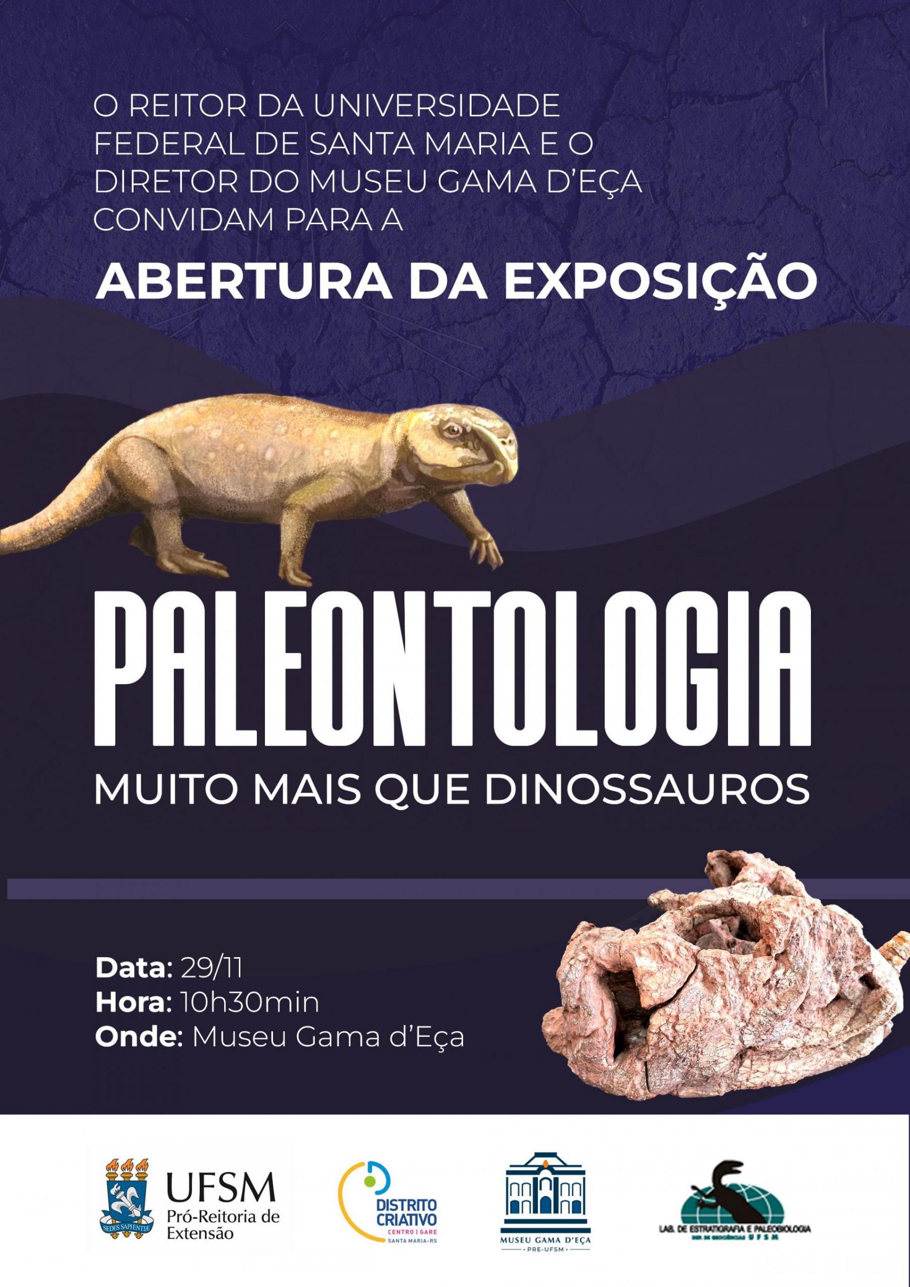 A abertura da exposição "Paleontologia: muito mais que dinossauros" será realizada na quarta-feira (29), às 10h30, no segundo andar do Museu Gama d'Eça (Rua do Acampamento, 81, centro de Santa Maria).