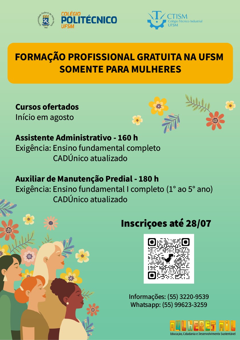 Estão abertas até o dia 28 de julho as inscrições para os cursos de formação inicial e continuada voltados exclusivamente para mulheres pelo projeto Mulheres Mil. No Colégio Politécnico e no CTISM serão oferecidos em agosto os cursos de assistente administrativo e auxiliar de manutenção predial.