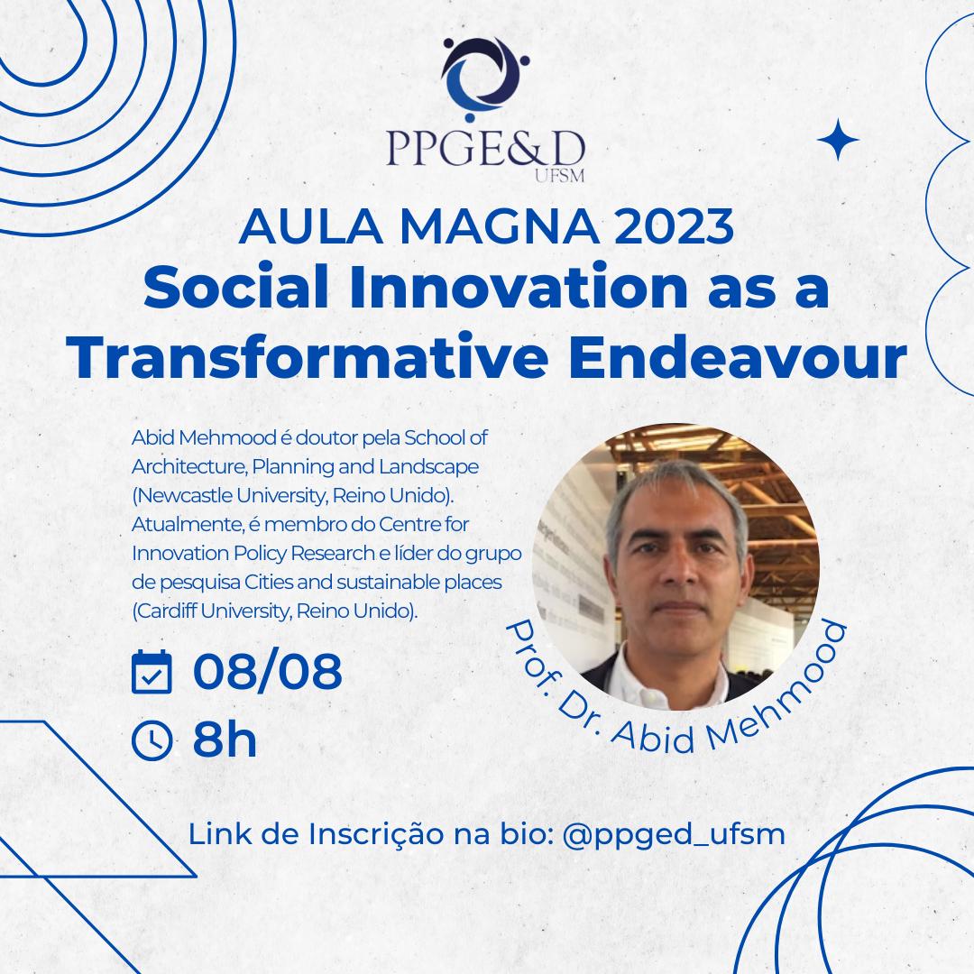O Programa de Pós-Graduação em Economia & Desenvolvimento (PPGE&D) da UFSM terá sua aula inaugural na terça-feira (8), às 8h, em formato virtual, transmitida ao vivo pelo canal do PPGE&D/UFSM no Youtube. A palestra intitulada “Social Innovation as a Transformative Endeavour" será ministrada pelo professor Abid Mehmood, da Cardiff University, Reino Unido, e mediada pela professora Rita Inês Paetzhold Pauli.