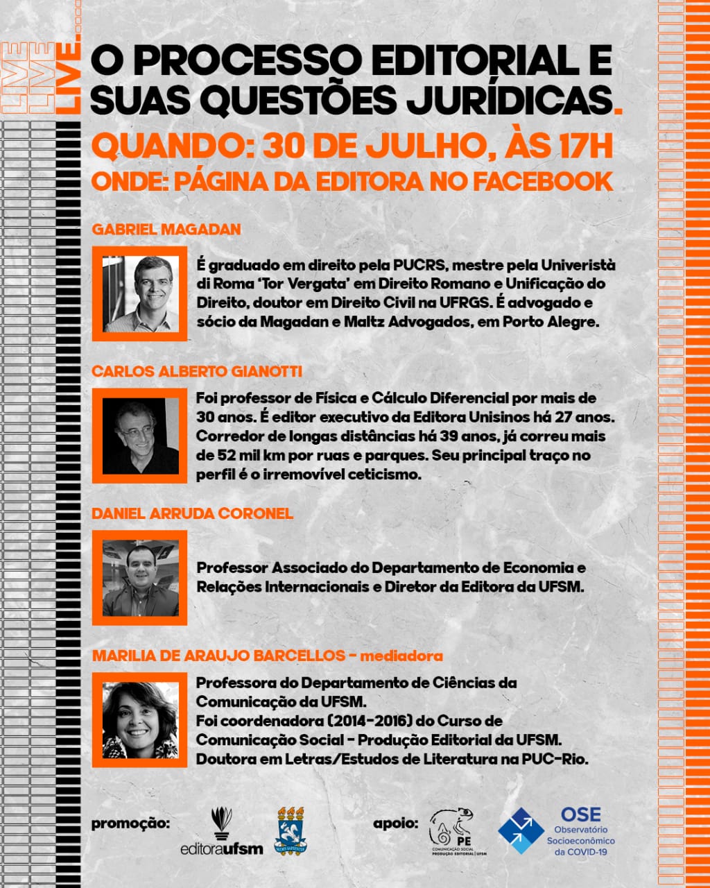 Também vão participar o diretor da Editora UFSM, Daniel Coronel, e a professora do Departamento de Ciências da Comunicação da UFSM Marília Barcellos, que fará a mediação do bate-papo.