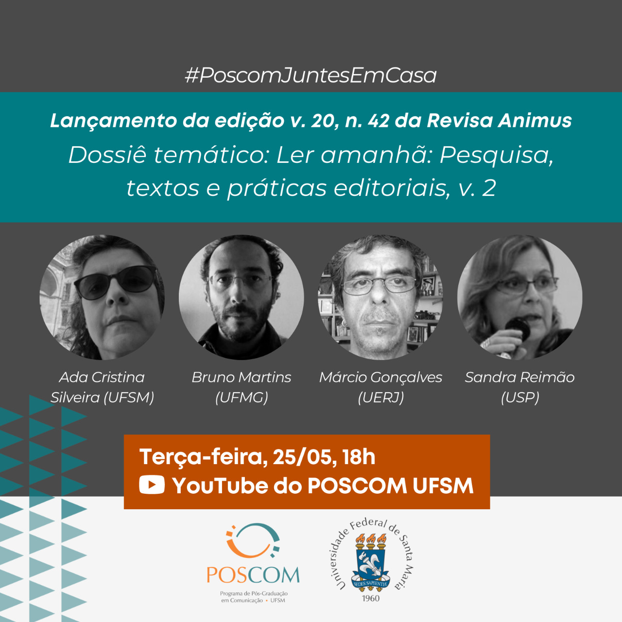 Acontece na próxima terça-feira, dia 25 de maio , a partir das 18h, na página do YouTube do Programa de Pós-graduação em Comunicação (POSCOM) da Universidade Federal de Santa Maria – UFSM, como parte do projeto #POSCOMJUNTESMECASA, o lançamento da edição v.20, n.42 (2021) de Animus. Revista Interamericana de Comunicação Midiática.