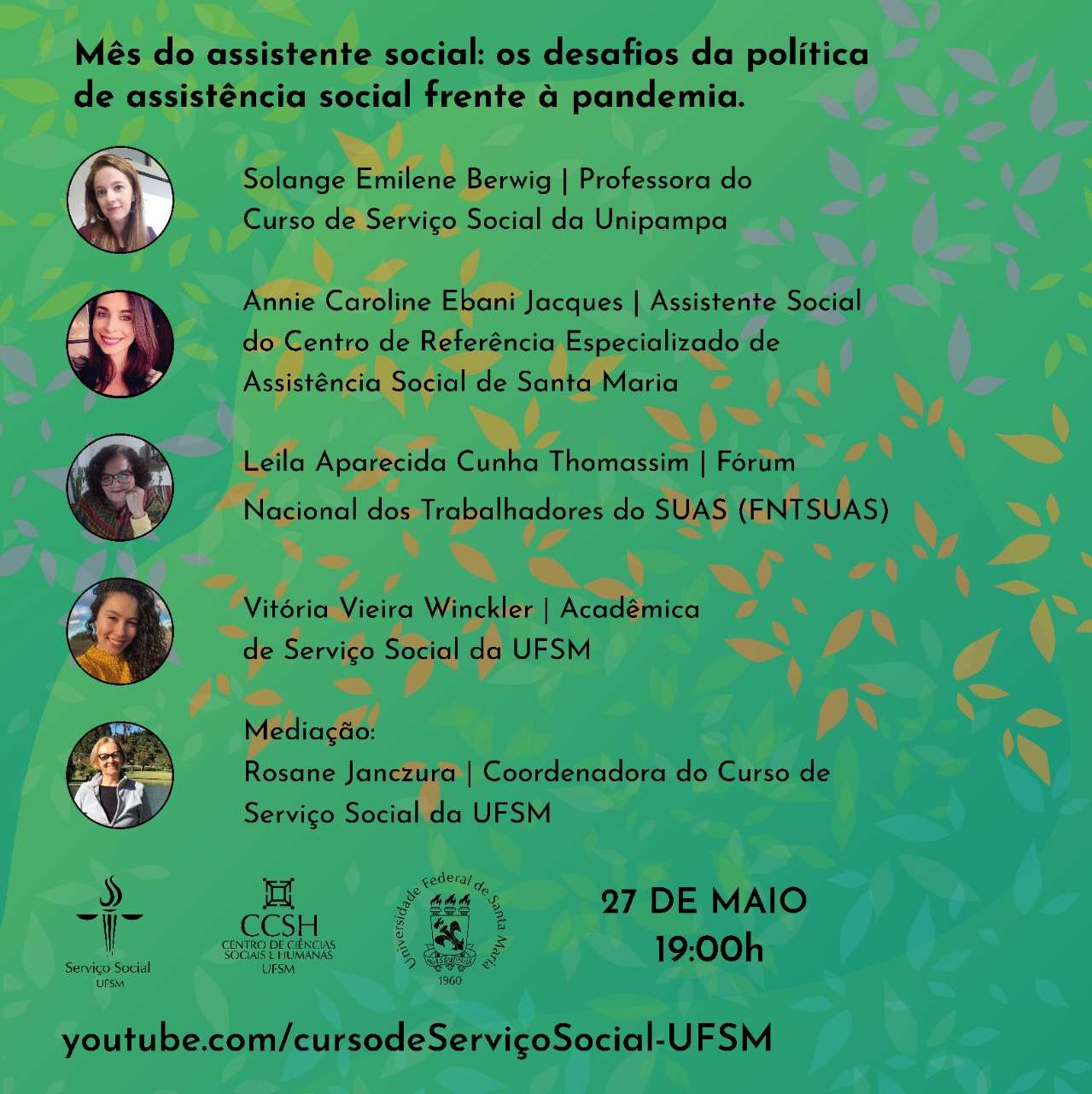 O curso de Serviço Social da UFSM promove o evento “Mês do assistente social: os desafios da política de assistência social frente à pandemia”, a ser realizado nesta quinta-feira (27), às 19h, no canal do YouTube