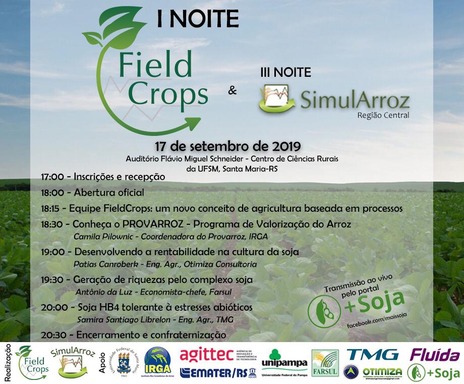Arte em formato quadrado com as informações sobre o evento sobre uma foto de lavouraNesta terça-feira (17), no Auditório Flávio Miguel Schneider, do CCR, ao lado do prédio 42 do campus sede da UFSM, ocorrem a 1º Noite FieldCrops e a 3ª Noite SimulArroz Região Central, com foco na sustentabilidade de lavouras de soja e arroz.