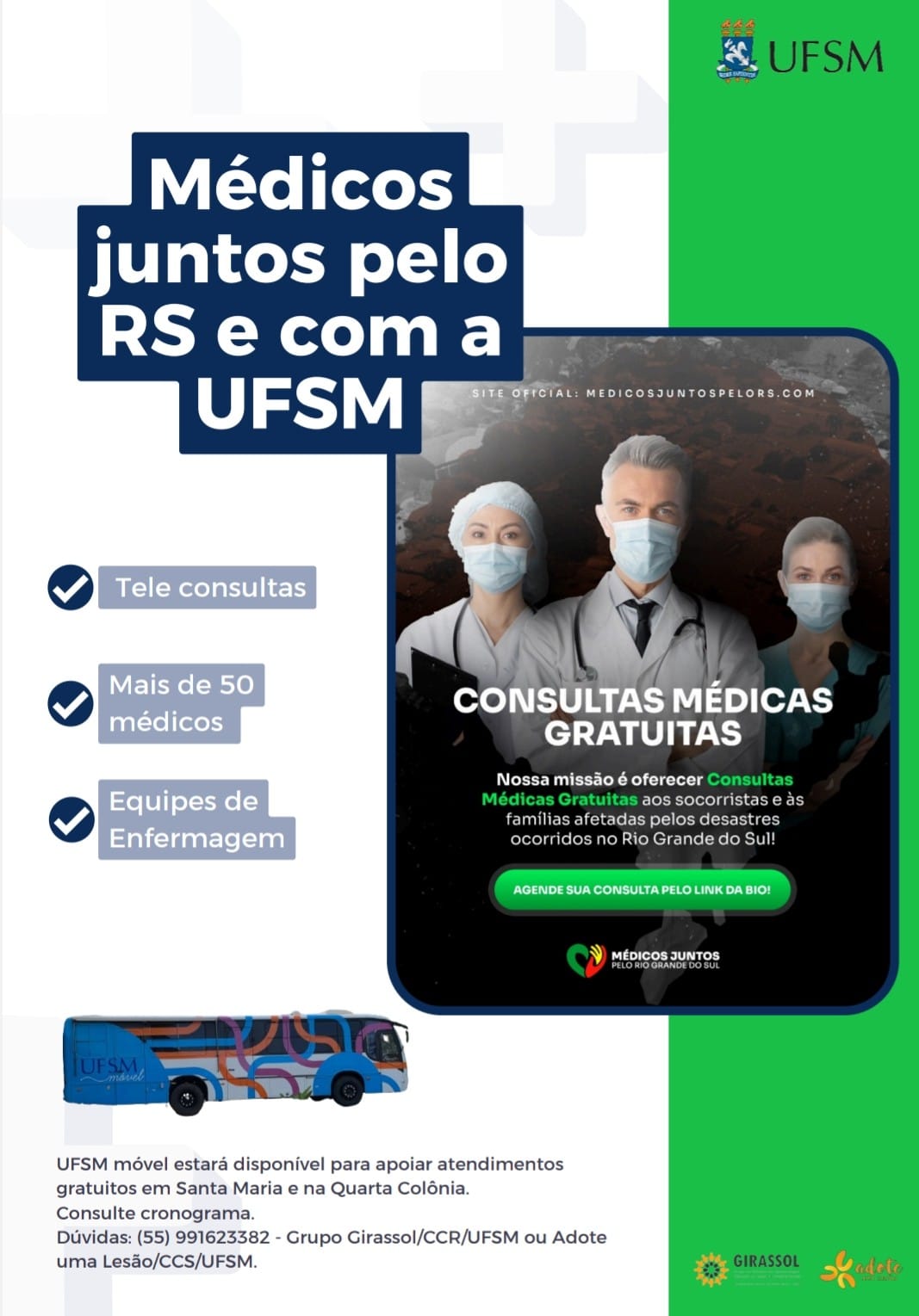 Em Santa Maria e nos municípios da Quarta Colônia, as atividades são realizadas no UFSM Móvel, motorhome da Instituição que, com internet e computadores, fornece apoio logístico para que as consultas online ocorram. A parceria entre o projeto e a UFSM une estudantes da graduação, da pós-graduação e servidores em prol dos afetados pelas fortes chuvas na região.
