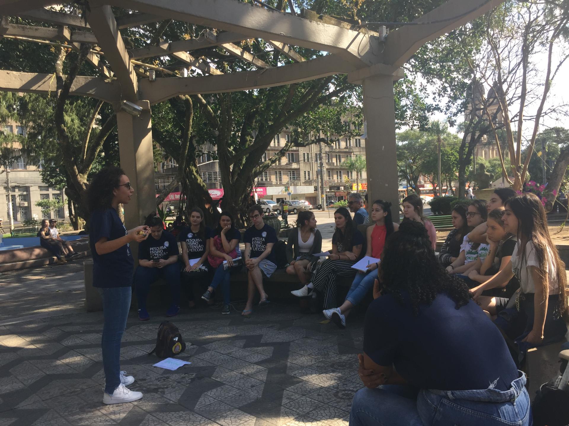 [caption id="attachment_48506" align="alignright" width="349"]Foto colorida horizontal mostra uma pessoa em pé e outras sentadas ouvindo-a no coreto da praça Rodas de conversa também fizeram parte da programação do evento[/caption]