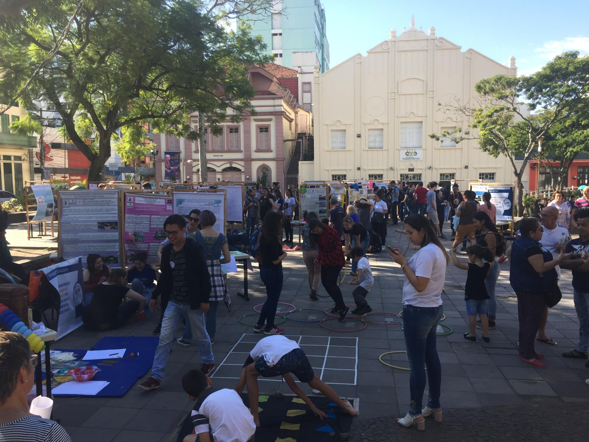 [caption id="attachment_48511" align="alignleft" width="350"]Foto colorida horizontal mostra pessoas conversando, olhando os banners e crianças brincando com bambolês dispostos no chão da praça Projetos desenvolvidos com crianças em escolas de educação básica foram apresentados[/caption]